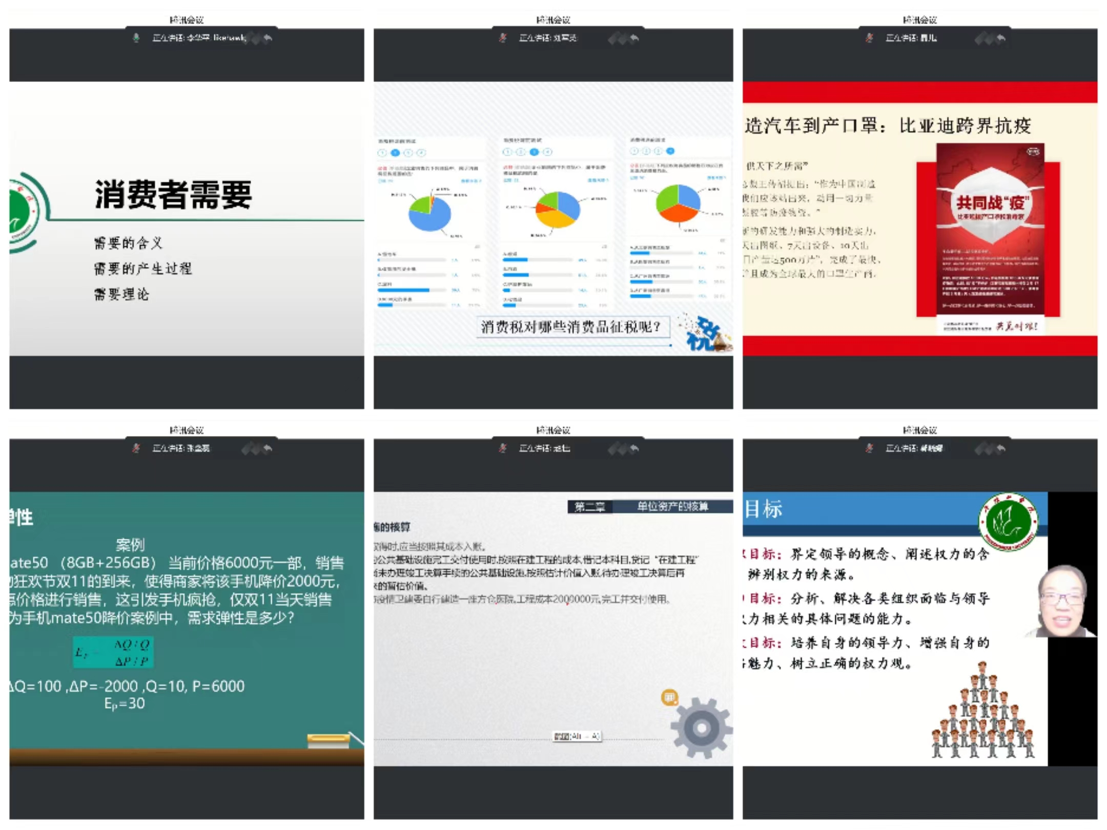 评选活动中,市场营销专业李华平老师、会计学专业刘军英老师、杨晶老师、张垒磊老师、赵壮老师以及工商管理专业郭晓娜老师分别以“消费者需要”、“消费税征收”、“成本性态”、“需求弹性”、“政府会计中的资产”、“权为民所用”为主题进行课程思政教学,六位老师分别从不同的专业与课程角度,深入浅出地展示了如何润物无声地在课程教学中融入“课程思政”元素,向参加观摩学习的老师们展示了一堂生动的专业课程思政课。
