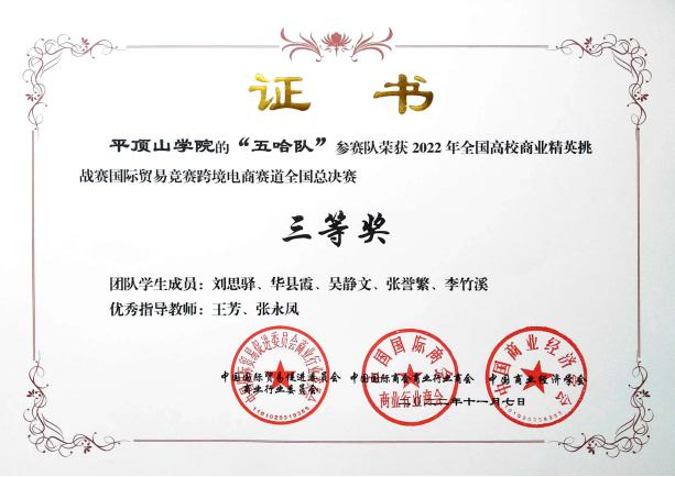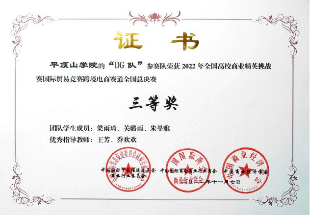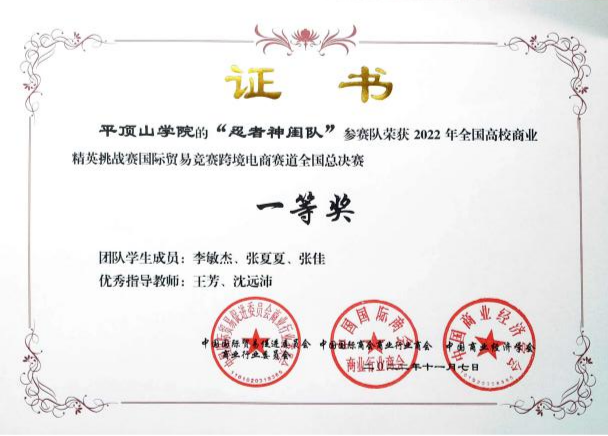 2022年11月9日,全国高校商业精英挑战赛跨境电商赛道总决赛落下帷幕,谈球吧国际经济与贸易专业学子李敏杰、张夏夏、张佳等在全国总决赛中荣获一等奖1项、三等奖2项,并创造了公司在该项赛事中的最好成绩。